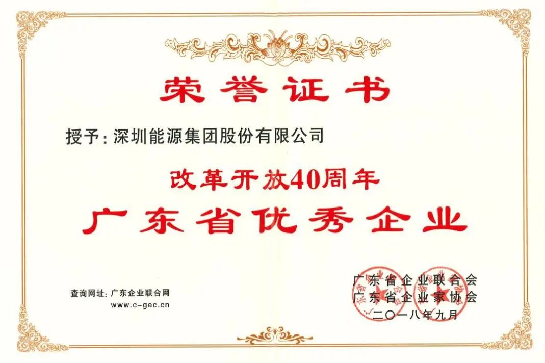 2018年9月,深圳能源获评“改革开放40周年广东省优秀企业”。