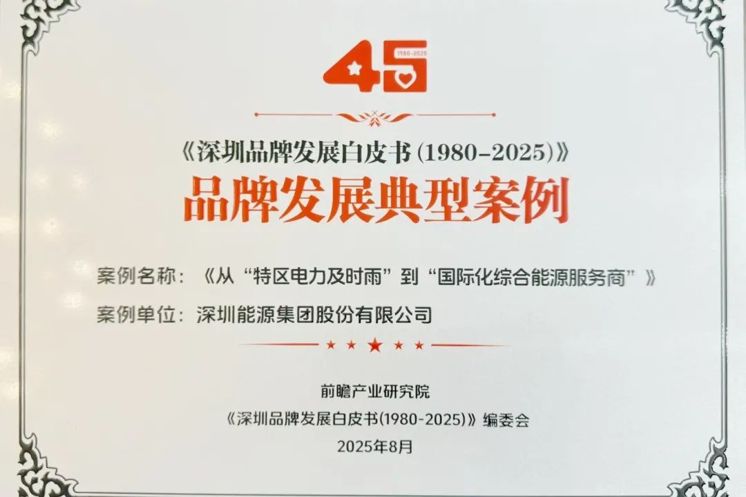 2025年8月,深圳能源入选《深圳经济特区建立45周年品牌发展白皮书(1980-2025)》典型案例。